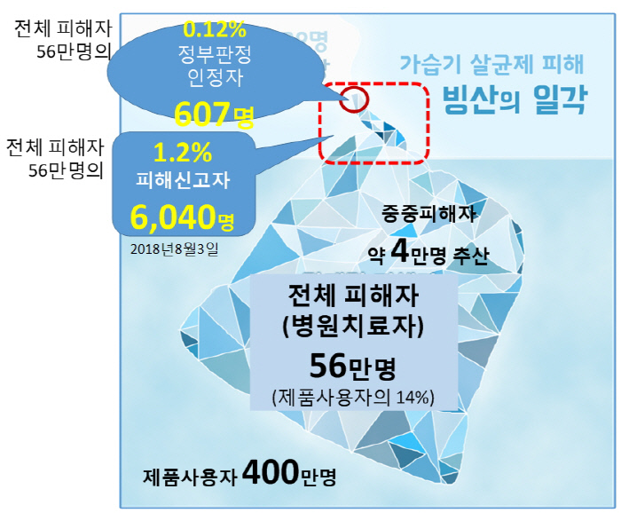 2017년 6월 14일까지 정부에 신고된 가습기 살균제 피해자는 모두 5628명이다. 이 중 사망자는 무려 1197명이다. 방송통신대학교 환경보건학과 이경무 교수가 발표한 연구 결과 ‘가습기 살균제 피해의 특성과 피해규모’에 따르면 가습기 살균제에 노출된 인구는 약 350만~400만명이고, 이 중 병원 치료 경험이 있는 인구는 약 30만~50만명이다.