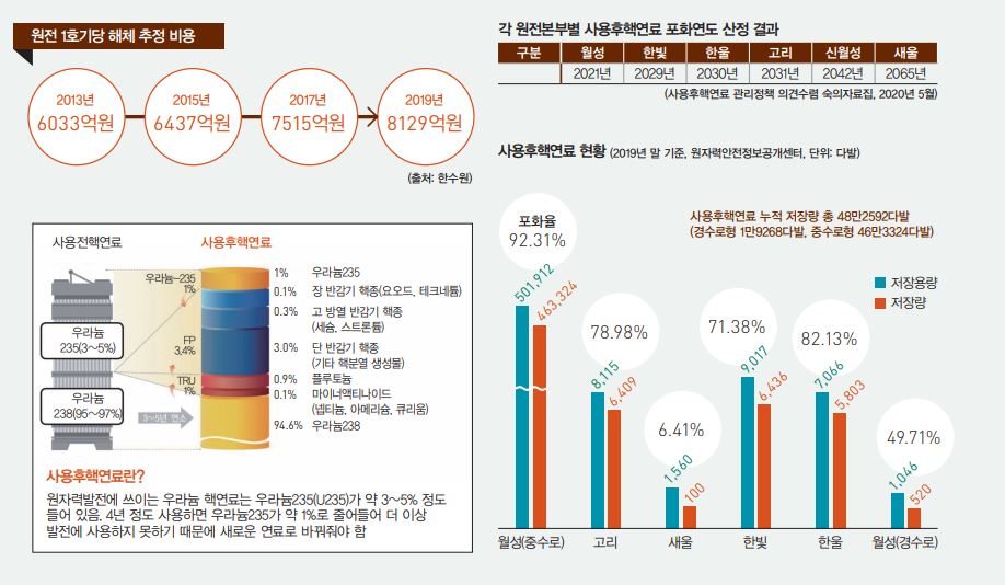 원전 1호기당 해체 추정비용과 사용후핵연료 현황