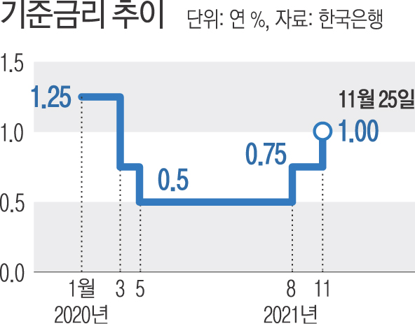 지난해 코로나19로 인한 경기 침체를 방어하려 0%대로 내려갔던 기준금리가 20개월 만에 다시 1%대로 인상됐다.