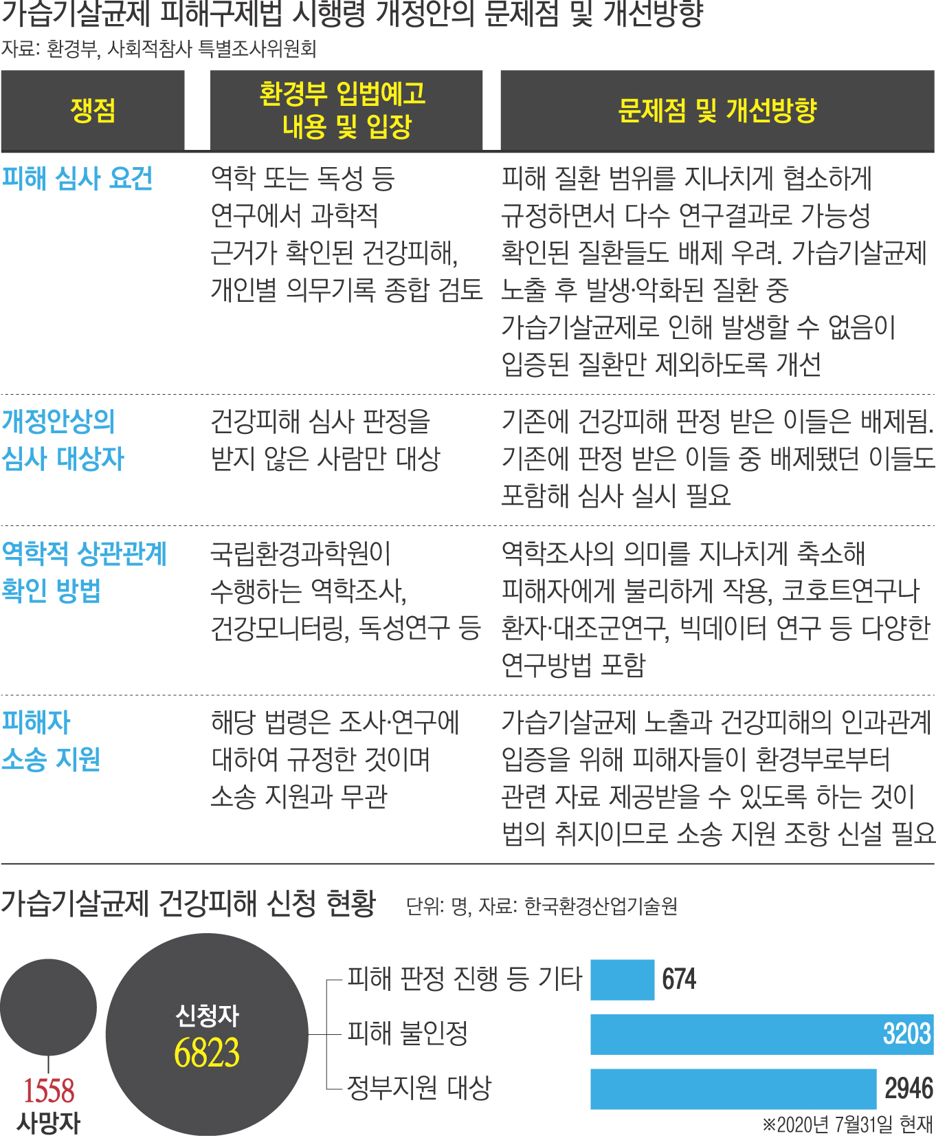 환경부가 가습기살균제 피해자들의 피해구제 범위를 확대하기 위해 ‘가습기살균제 피해구제를 위한 특별법’(가습기살균제피해구제법) 개정을 추진한다. 그동안 가습기살균제 피해 인정 범위를 축소·제한한다는 지적을 받아온 일부 조항들을 뒤늦게 수정하겠다고 밝힌 것이다. 환경부가 특별법을 만들 때 피해구제 범위와 밀접하게 연관된 조항에 대해 정밀한 법적 검토를 거치지 않았다는 비판도 나온다. 박천규 환경부 차관은 지난 27일 열린 1차 가습기살균제 청문회에서 “9월 중 의원입법으로 국회에 가습기살균제피해구제특별법 개정안을 제출할 예정”이라고 밝혔다.