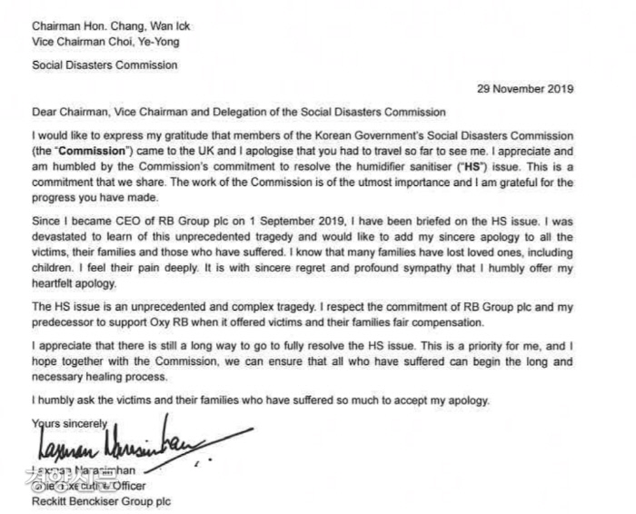 옥시 본사인 레킷벤키저(RB)의 신임 최고경영자(CEO) 락스만 나라시만이 “가습기살균제 피해자와 그 가족들에게 사죄하고 문제 해결을 위해 노력하겠다”고 말했다. 1일 ‘가습기살균제사건과 4·16세월호참사 특별조사위원회’에 따르면 나라시만은 지난달 29일 영국 RB본사에서 특조위의 다국적기업 현지조사단과 만나 이같이 말하고 홈페이지에 사과 서한을 게재했다.