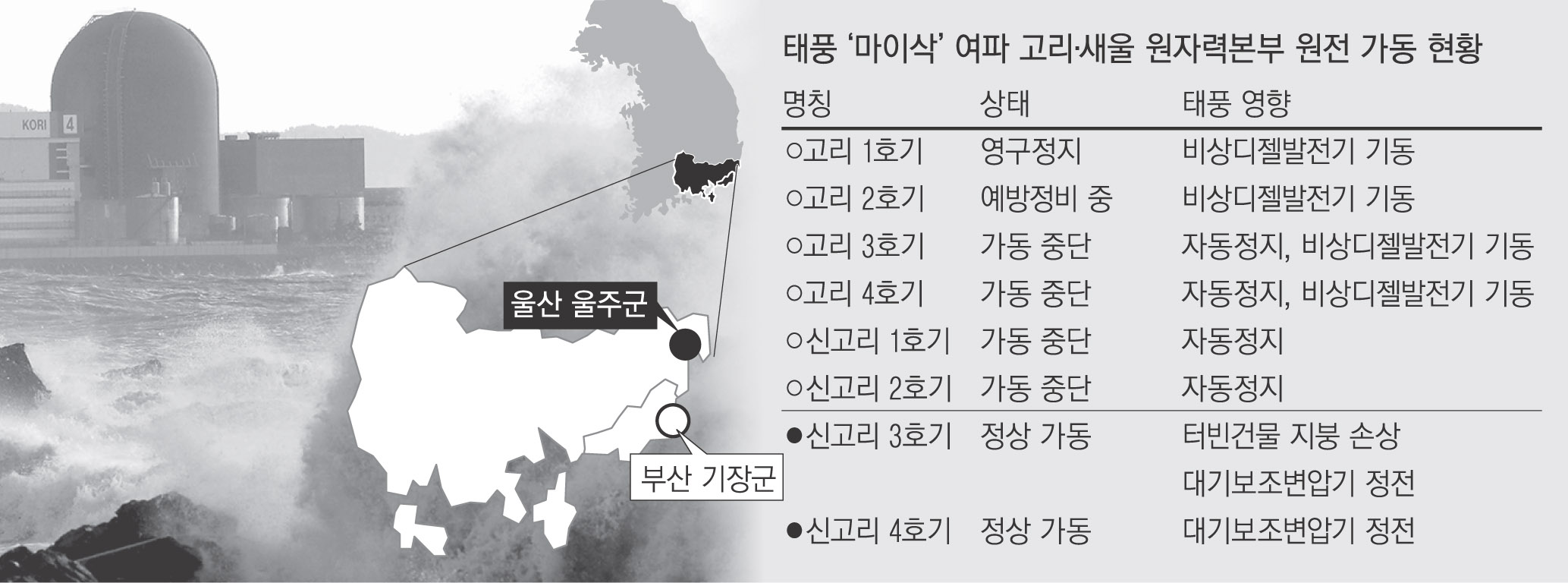 한반도 동남부를 휩쓸고 지나간 태풍 ‘마이삭’이 부산과 울산의 원자력발전소 8기 전체에 문제를 일으켰다. 태풍 전 정상운전 중이던 원전 6기 중 4기가 태풍의 영향으로 자동정지됐고, 나머지 원전들도 전력공급 이상으로 비상발전기가 작동되거나 강풍으로 건물 지붕이 손상되는 등 크고 작은 이상이 발생했다. 원전 자동정지는 고장이 아니라 정상적인 안전조치 중 하나지만, 기후위기가 일상화되면서 원전의 취약성이 시험대에 오르고 있다.