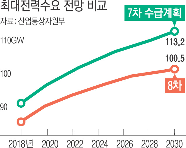 신고리 5·6호기가 반영된 7차 수급계획에 따르면 2022년 국내 전체 발전설비 용량은 130GW다. 신고리 5·6호기의 발전용량은 각각 1.4GW로, 전체 용량에서 차지하는 비중은 약 2%에 불과하다. 하지만 올해 안에 나올 8차 수급계획에선 전력수요 전망치가 과거보다 큰 폭으로 낮아져 신고리 5·6호기 건설 명분은 더욱 약화될 것으로 전망된다.