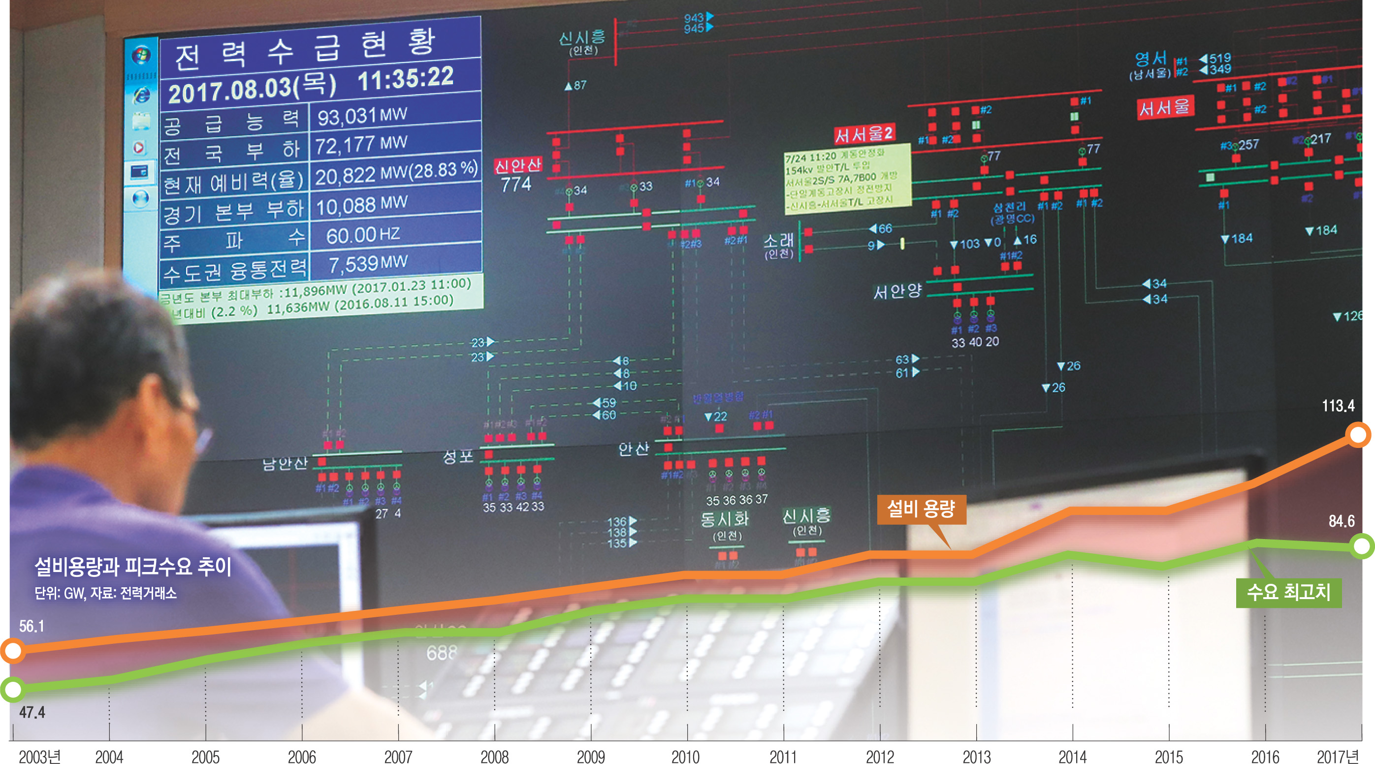 2017년 9월 7일 전력거래소의 전력통계정보시스템에 따르면 올해 최대 전력수요량은 84.59GW(7월21일)였다. 전체 발전설비 용량(올해 약 113GW) 가운데 가동되지 않은 발전설비 비중은 34.0%였다. 전력수요가 급증하는 여름철에 발전설비 예비율이 30%를 넘어선 것은 14년 만에 처음이다. 정부는 2년 전 7차 수급계획을 통해 2029년까지 22%의 설비 예비율을 확보하겠다고 밝혔는데 올해 이미 이 수준을 훨씬 뛰어넘은 것이다. 다시 말해 신고리 5·6호기가 없어도 현재 발전설비 여유는 충분한 셈이다.