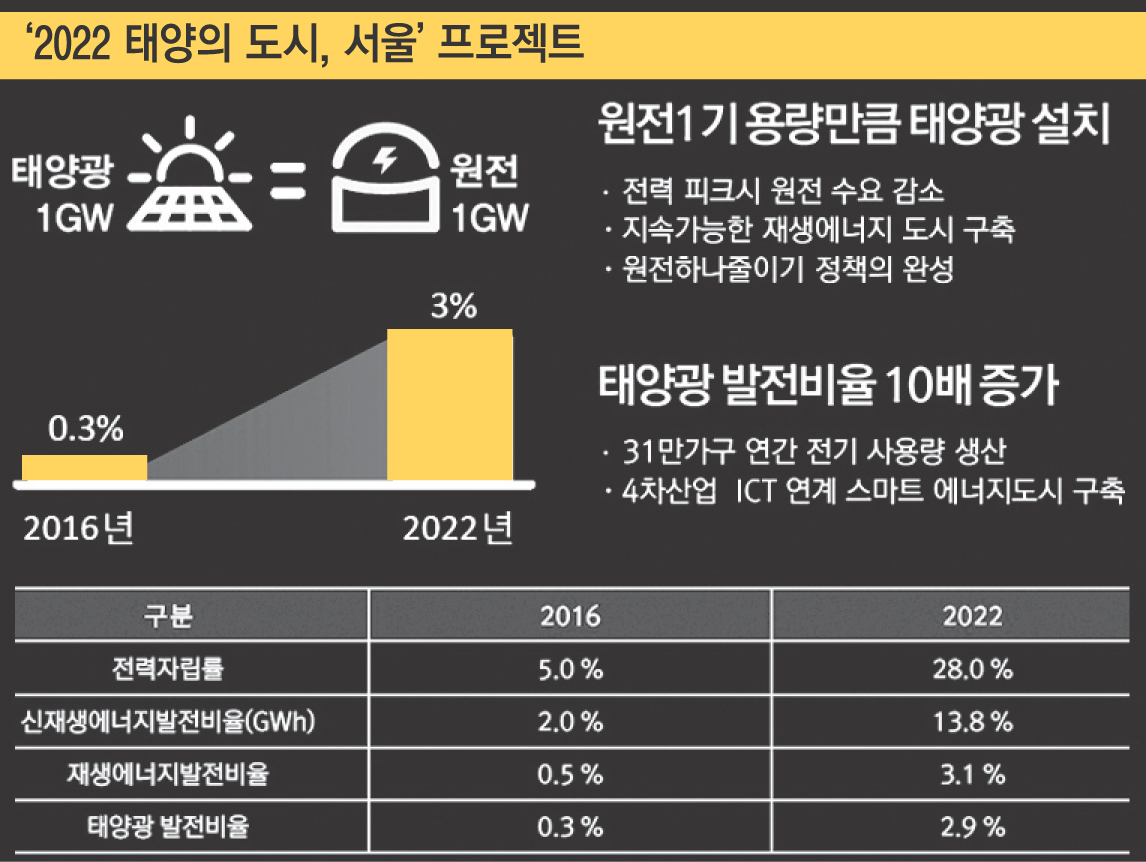 서울시가 3가구 중 1가구꼴로 태양광을 보급해 에너지를 자체 생산하도록 하는 등 ‘태양의 도시’ 프로젝트를 추진한다. 서울시는 오는 2022년까지 태양광 발전 설비를 확대 보급해 원전 1기 설비용량인 1GW(1000㎿)를 생산하겠다는 ‘2022 태양의 도시, 서울’ 계획을 2017년 11월 21일 발표했다. 서울에 사는 3가구 중 1가구는 태양광 에너지를 자체 생산할 수 있도록 보조금 지원을 확대한다는 것이 핵심이다.