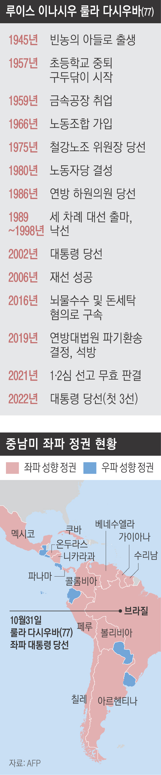 ‘남미 좌파의 대부’로 불리는 루이스 이나시우 룰라 다시우바 전 브라질 대통령(77·사진)이 퇴임 후 약 12년 만에 대통령직에 복귀하게 됐다.