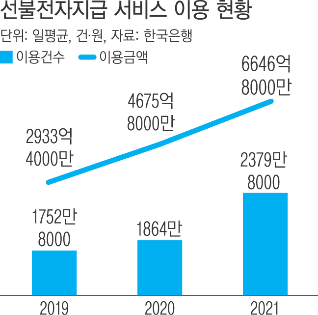 카카오페이나 네이버페이 등과 같은 선불전자지급 서비스 이용 규모가 급증세를 보이고 있다.