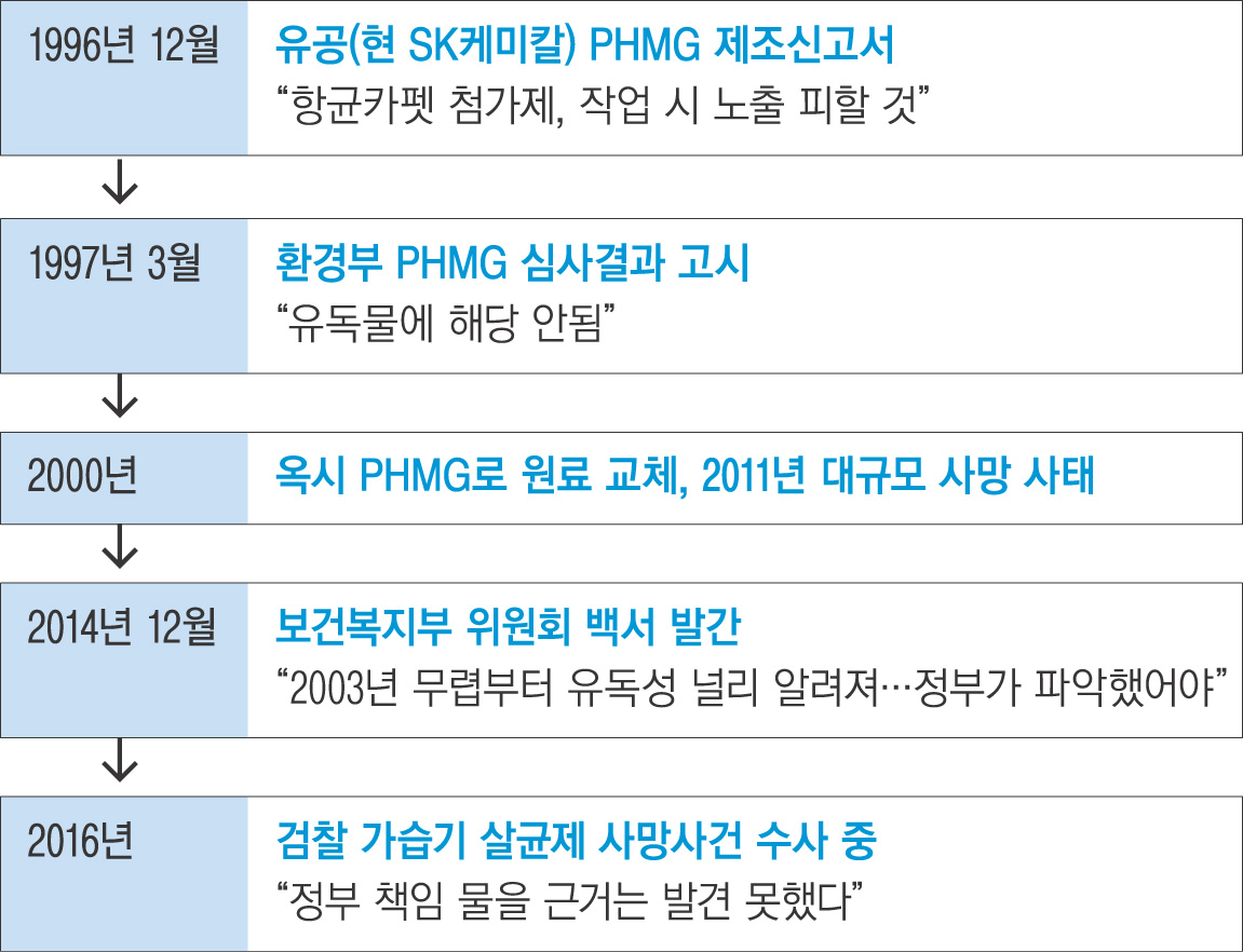 PHMG는 유공(현 SK케미칼)이 세계 최초로 개발한 화학물질로, 1996년 12월 정부에 제조신고서를 제출했다. 이 신고서를 보면 SK는 “이 물질은 항균카펫 등에 첨가된다”며 “사용할 때 보호장구를 착용하고 작업자 노출을 최소화하기 위해 충분히 환기해야 한다”고 적시했다. 이듬해 3월 환경부는 이 물질에 대한 유해성 심사 결과로 “유독물에 해당 안됨”이라고 관보에 고시했다. 옥시레킷벤키저는 이를 바탕으로 2001년 이 물질을 활용해 가습기 살균제를 제조했다