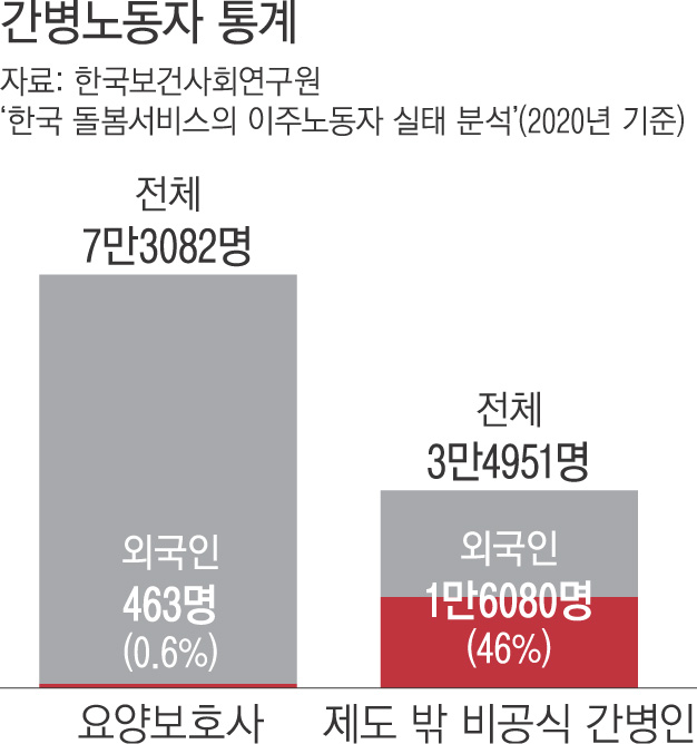 한국보건사회연구원의 ‘돌봄 서비스의 이주노동자 실태분석’에 따르면 2020년 3월 기준 외국인 간병인 수는 전체 46%에 달했다.