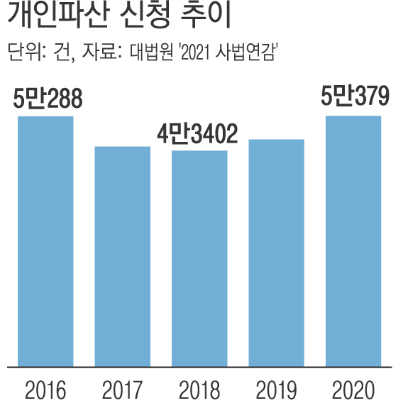 대법원 법원행정처가 발간한 ‘2021 사법연감’에 따르면 지난해 법원에 접수된 개인파산은 5만379건으로, 전년(4만5642건)보다 4737건(10.4%) 증가했다.