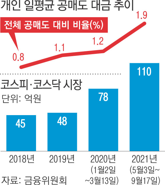 전체 공매도 대금에서 개인 투자자가 차지하는 비중은 지난해 공매도 중단 이전(1월2일~3월13일) 1.2%에서 5월3일 재개 이후 지난 17일까지 1.9%로 0.7%포인트 높아지는 데 그쳤다.