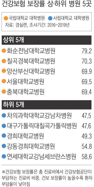 국립대병원과 사립대병원의 환자 의료비 부담률이 최대 2.5배 차이가 난다는 조사 결과가 나왔다. 일부 사립대병원의 건강보험 보장률은 50%도 되지 않아 환자 의료비 부담률이 컸다. 코로나19 상황에서 공공병원의 역할 등이 확인된 만큼 공공의료 확충 등이 시행돼야 한다는 지적이 나온다.