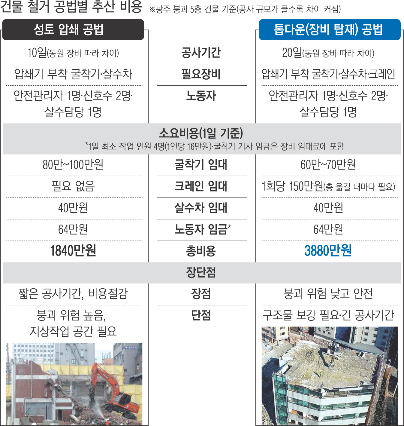 광주에서 건축물 해체 업체를 운영하는 A씨는 11일 “철거는 공사기간이 길어질수록 비용부담이 늘어난다”며 “원청업체라면 안전에 좀 더 신경 쓰겠지만 하도급업체는 그렇게 하면 남는 게 없다”고 말했다.