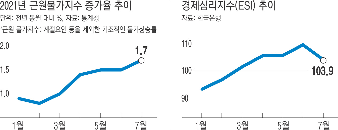 지난달 소비자물가가 약 9년 만에 최고치를 기록했지만 인플레이션(물가오름세)보다 오히려 경기 회복세가 꺾이는 국면을 걱정해야 한다는 것이다.