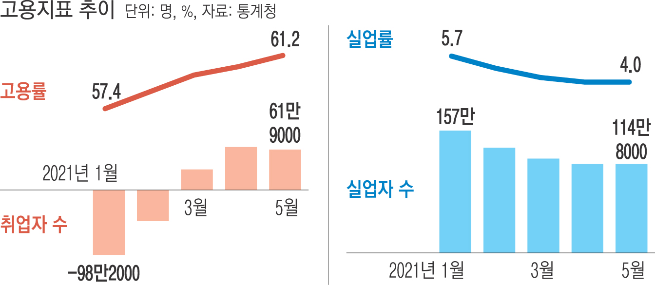 5월 취업자 수 증가폭이 60만명을 웃돌며 두 달 연속 고용지표가 개선됐지만, 코로나19 직격탄을 맞은 도·소매업과 자영업의 일자리는 쪼그라든 것으로 나타났다.