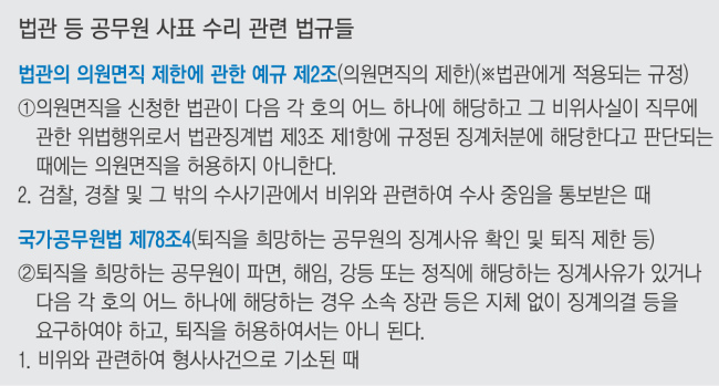 김 대법원장이 임 판사의 사표를 받지 않은 것이 옳았다는 반론도 만만치 않다. 국가공무원법, 법관징계법 등에는 탄핵 사유가 있는 공무원의 사표 수리 여부에 관한 명시적 규정은 없다. 다만 공통적으로 비위가 있는 공무원의 자진 퇴직을 허용하지 않고 있다. 김 대법원장의 사표 반려를 평가할 때 우선 판단 근거가 될 수 있는 법률은 법관징계법이다. 이 법 제7조의4를 보면 대법원장은 법관이 퇴직을 희망하는 경우 징계 사유가 있는지 확인해 징계를 청구해야 한다고만 돼 있고, 사표 수리를 허용해도 되는지 규정이 없다.