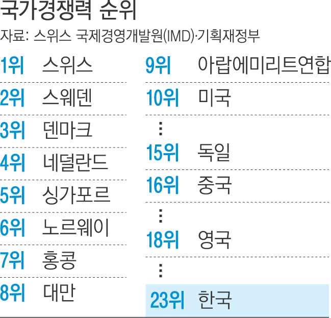 한국이 스위스 국제경영개발원(IMD)이 평가한 올해 국가경쟁력 순위에서 지난해와 동일한 23위를 기록했다.