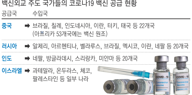 코로나19 백신을 선점한 나라들이 백신을 외교 수단으로 활용하고 있다. 부자 나라들이 백신을 독점하다시피 하자 백신을 구하기 힘든 개발도상국과 빈국에 백신을 공급하며 ‘소프트파워’를 키우고 있는 것이다. 러시아와 중국은 물론 인도와 이스라엘까지 백신외교전에 뛰어들었다. 그러나 백신을 가진 나라들이 국익에 도움이 되는 나라를 선별해 백신을 공급하는 ‘체리피킹’을 하고 있다는 지적도 나온다.