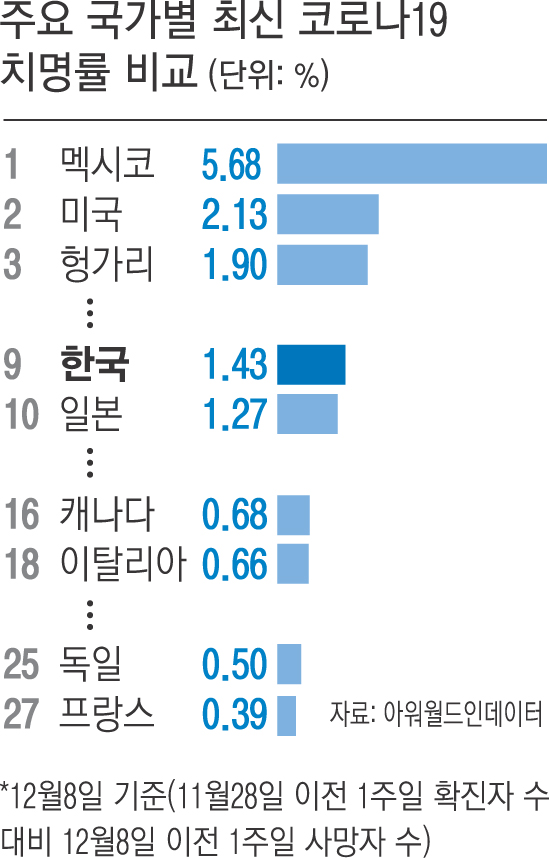 한국의 치명률은 OECD 38개 회원국 중에선 멕시코(5.68%), 미국(2.13%), 헝가리(1.90%), 코스타리카(1.88%), 라트비아(1.78%), 콜롬비아(1.66%), 폴란드(1.63%), 그리스(1.46%)에 이어 9번째로 높다.