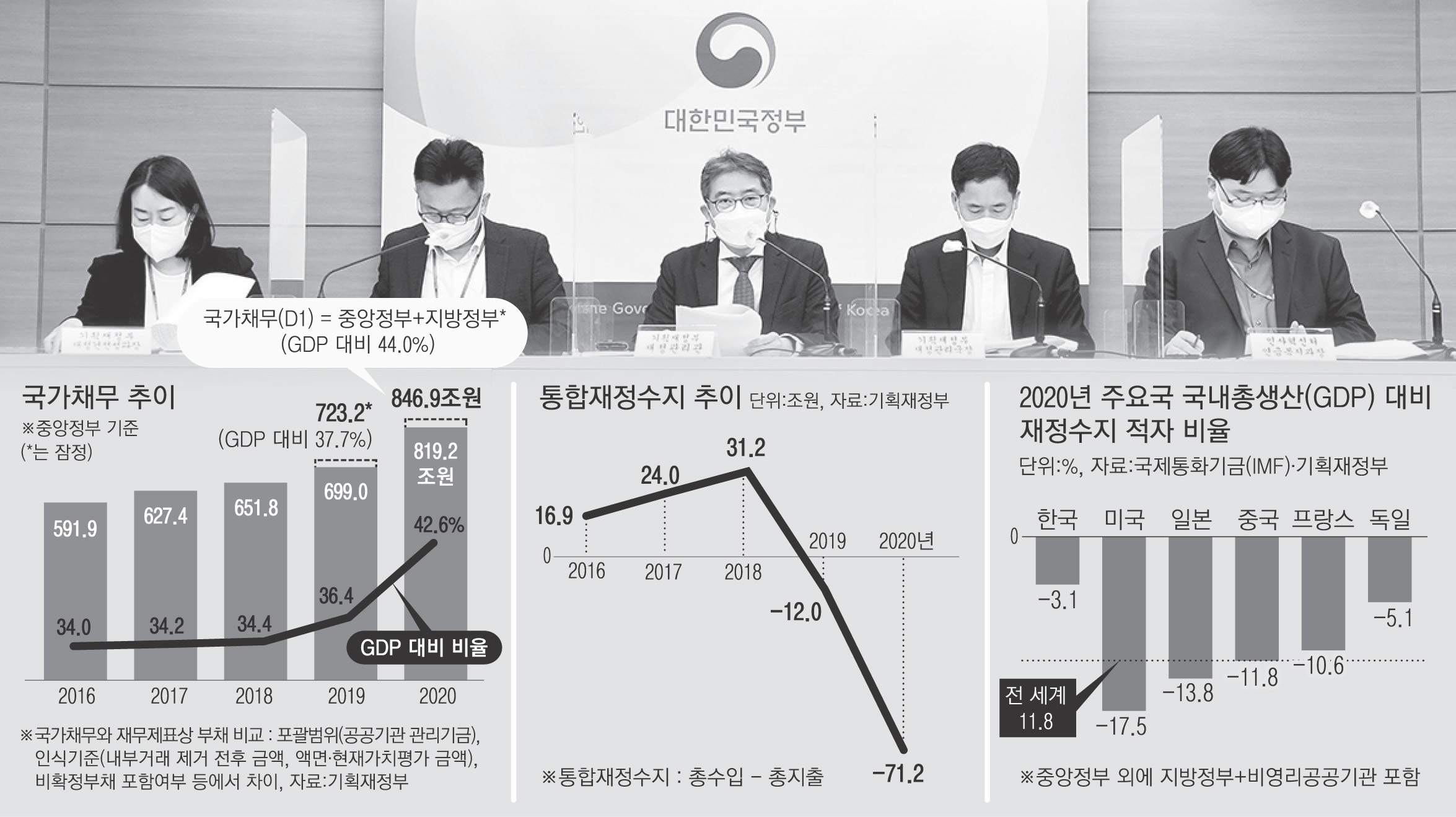 재정수지 적자폭은 아직까진 다른 국가에 비해 크지 않지만, 나랏빚 불어나는 속도가 지나치게 빠른 만큼 민간경제가 코로나19 경제충격을 견뎌낼 만큼 재정지출을 하되 지출 구조조정이 필요하다는 목소리가 나온다.