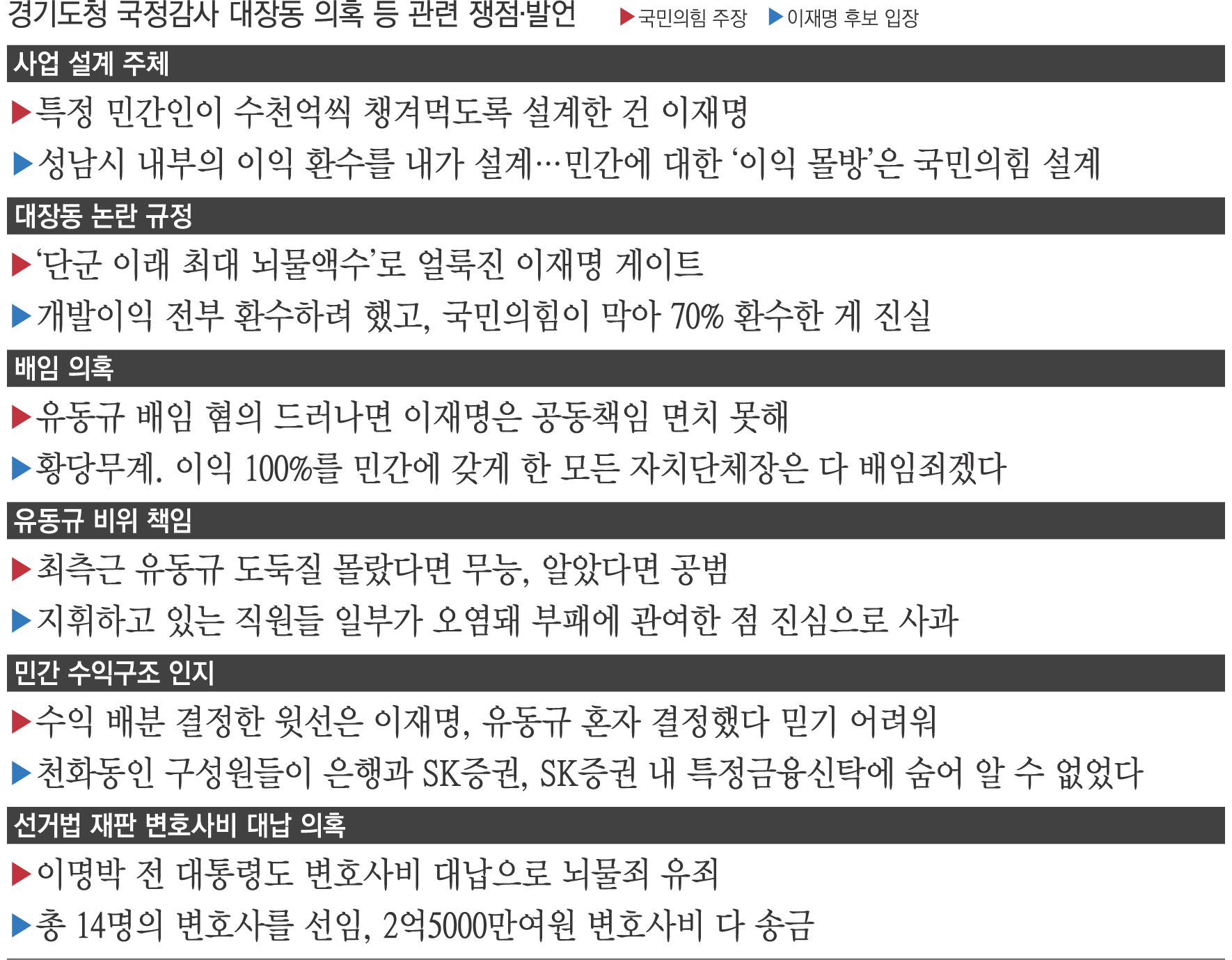 더불어민주당 대선 후보인 이재명 경기지사는 18일 국회 행정안전위원회의 경기도 국정감사를 대장동 의혹 해명의 장으로 삼았다.