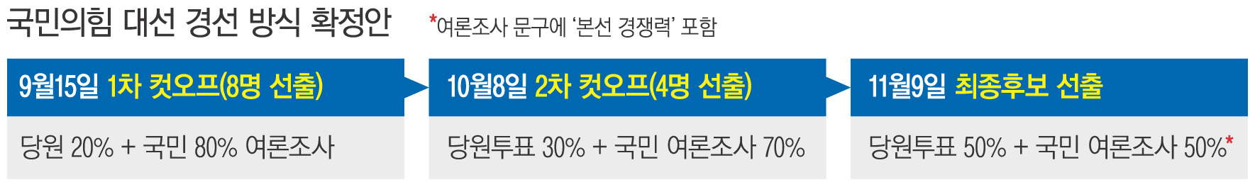 대신 8명으로 압축하는 1차 예비경선(컷오프)은 당초 100% 국민 여론조사에서 20% 책임당원 여론조사와 80% 국민 여론조사로 경선룰을 변경했다.