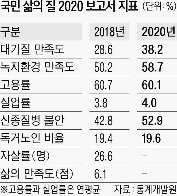 코로나19 이후 대기질과 수질 등 환경에 대한 국민 만족도는 높아진 반면 고용과 실업, 신종질병 불안 등에 대한 지표는 나빠진 것으로 나타났다. 전반적인 삶의 만족도 역시 악화됐다.