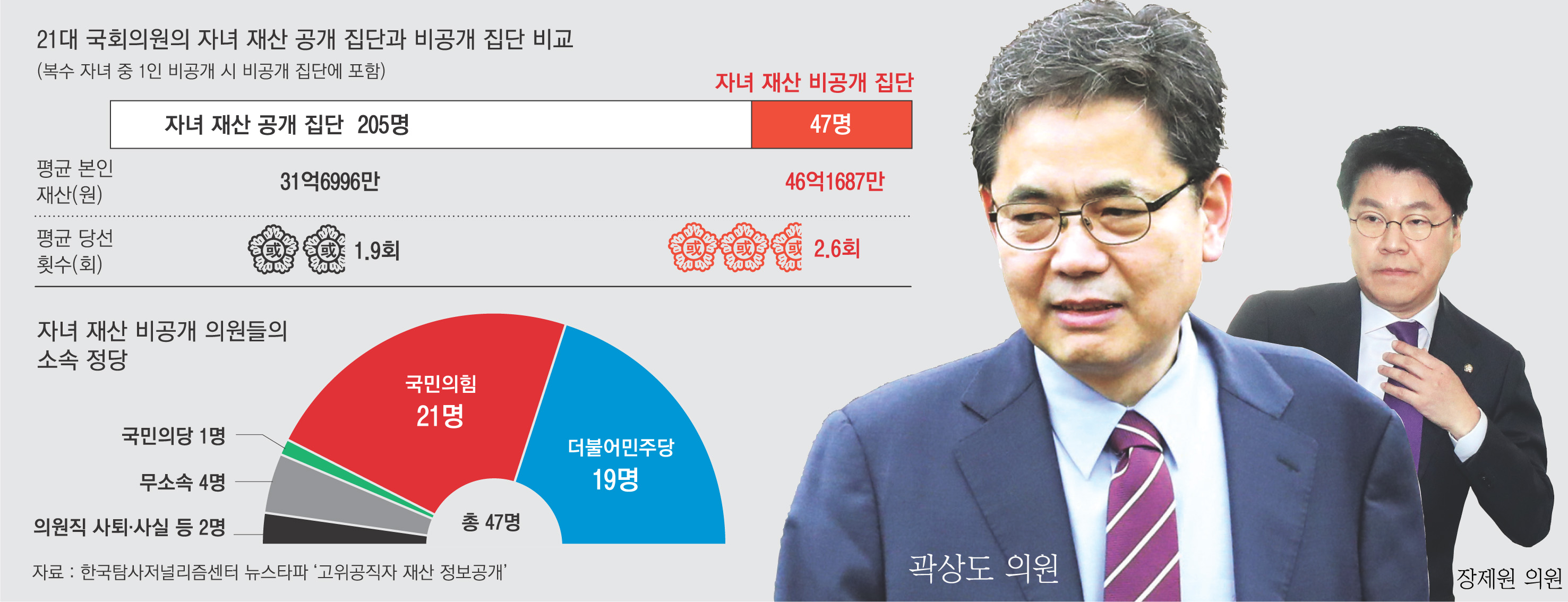 경향신문 데이터저널리즘팀 다이브가 2011년 이후 의원들의 재산신고 내역을 분석한 결과, 자녀들의 재산을 공개한 의원들보다 공개를 거부한 의원들의 평균 재산이 많은 것으로 나타났다.