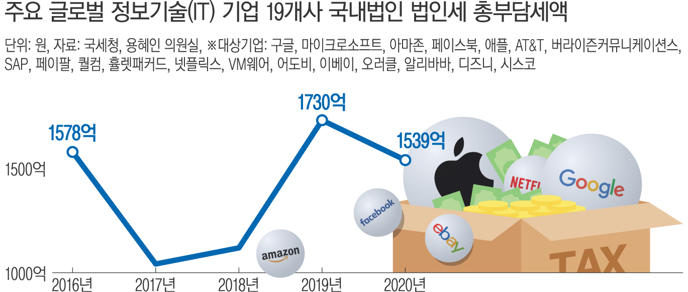 5일 용혜인 기본소득당 의원이 국세청에서 받은 ‘최근 5년간 주요 글로벌 IT 국내법인 법인세 총부담세액’을 보면 19개 기업은 지난해 총 1539억원의 세금을 납부했다.