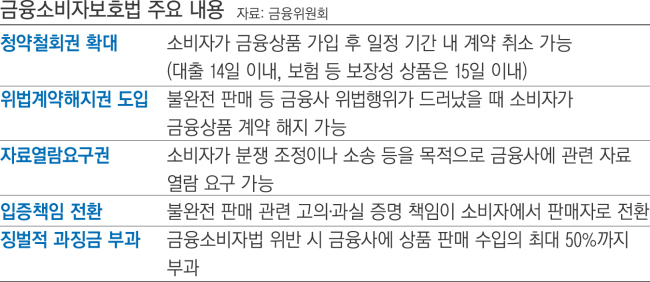 금융소비자가 설명을 충분히 듣지 못한 상품 계약이나 가입을 해지할 수 있도록 보장하는 등 그동안 허약했던 소비자 권리 보호가 크게 강화될 것으로 전망된다. 다만 금융사 입장에서는 책임과 처벌 수위가 높아지면서 시행 초기 판매 위축이 불가피할 것이라는 예측도 나온다.