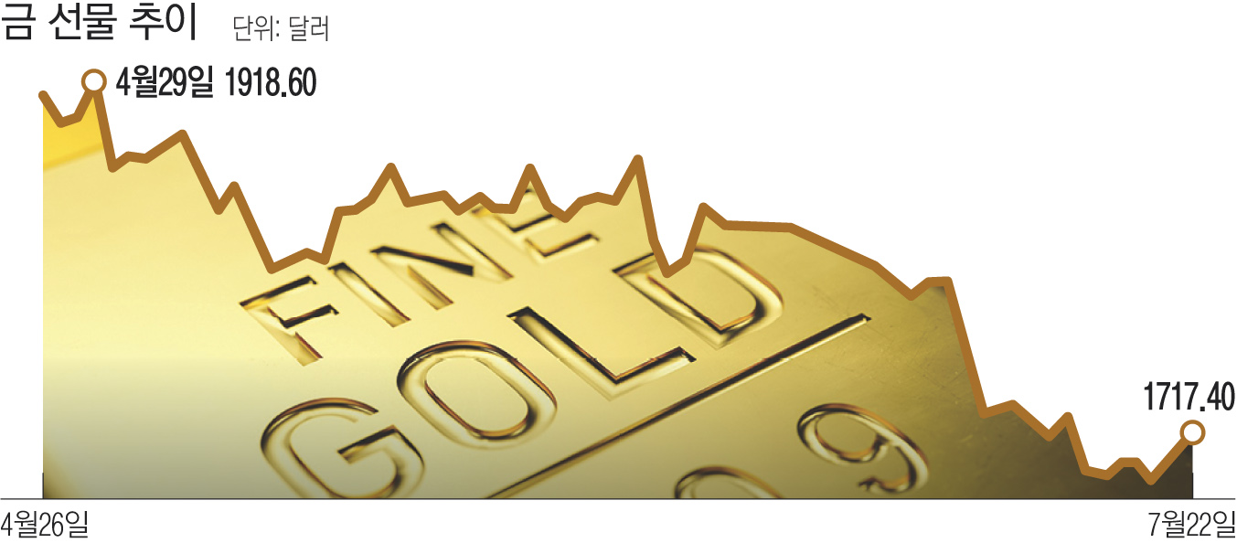 24일(현지시간) 월스트리트저널(WSJ)에 따르면 7월 들어 금 선물가격은 4.4% 떨어진 온스당 1727.40달러에 거래되고 있다.