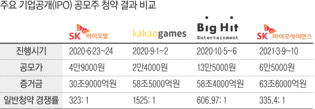10일 금융투자업계에 따르면 지난 9일부터 이틀 동안 대표 주관사인 NH투자증권 등 6개 증권사가 접수한 SK바이오사이언스 청약에 약 63조6000억원의 증거금이 몰렸다. 지난해 방탄소년단 소속사인 빅히트엔터테인먼트(58조4237억원)는 물론 카카오게임즈가 세운 청약 증거금 기록 58조5543억원을 넘어선 역대 최대 금액이다. 청약 첫날인 지난 9일 14조1474억원이 증거금으로 몰렸고, 둘째 날에는 3배가 넘는 48조원가량이 밀려들었다. 일반청약 신청 건수도 239만8000건으로 역대 최다 기록을 경신했다. 빅히트(25만3055건), SK바이오팜(23만1886)은 물론 카카오게임즈(41만8261건)의 5배를 웃도는 규모다. 증권사에 배정된 물량의 절반을 청약자에게 균등 배분하는 방식이 도입돼 소액 투자자들도 최소 1주를 받을 수 있을 것으로 예상된 데다 여러 증권사에 중복 청약할 수도 있었던 점이 이번 청약 열기의 원인으로 분석된다.