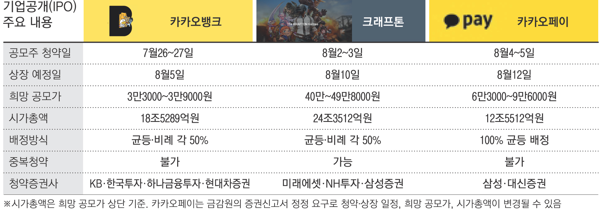 하반기 초대형 공모주로 꼽히는 카카오뱅크와 크래프톤의 일반 청약이 7월 말과 8월 초에 잇따라 잡혀 있다.