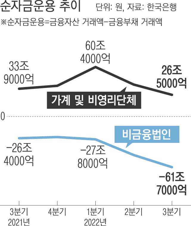 반면 기업들은 차입이 크게 늘어 순자금조달 규모가 통계를 집계한 이래 최대 규모인 61조7000억원에 달했다.
