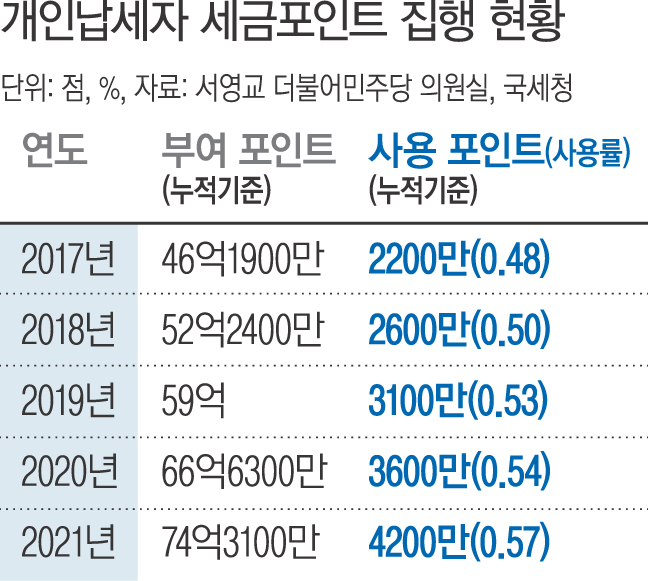 국회 기획재정위원회 소속 서영교 더불어민주당 의원이 국세청에서 받은 자료를 보면 2021년까지 사용된 개인 납세자의 세금포인트는 누적 4200만점이었다.