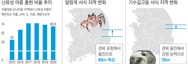 온도가 상대적으로 늦게 상승하는 해저바닥에 사는 게·소라의 서식처도 북상한 것으로 조사됐다.