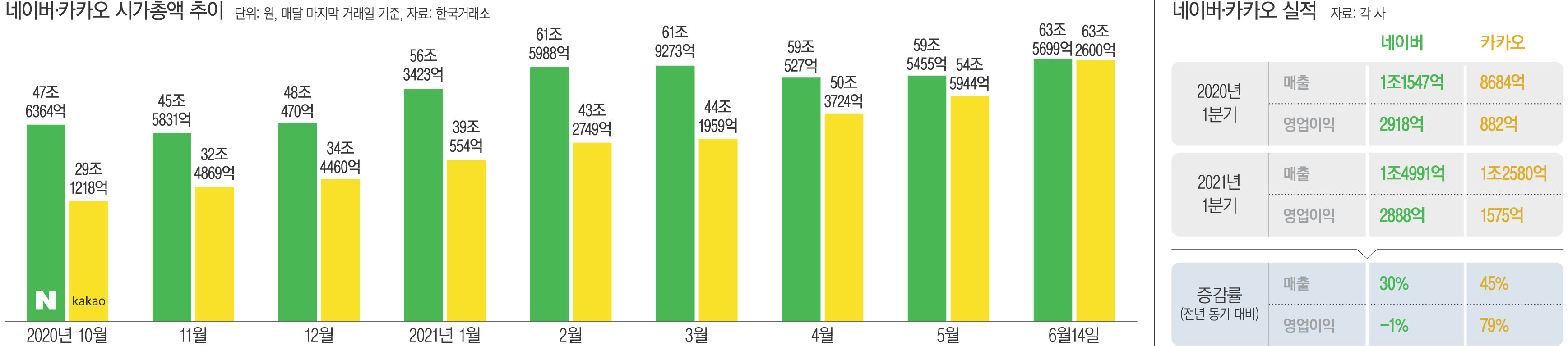 카카오뱅크 등 주요 자회사 상장에 대한 기대감을 발판 삼아 카카오가 네이버를 바짝 뒤쫓는 양상이다.