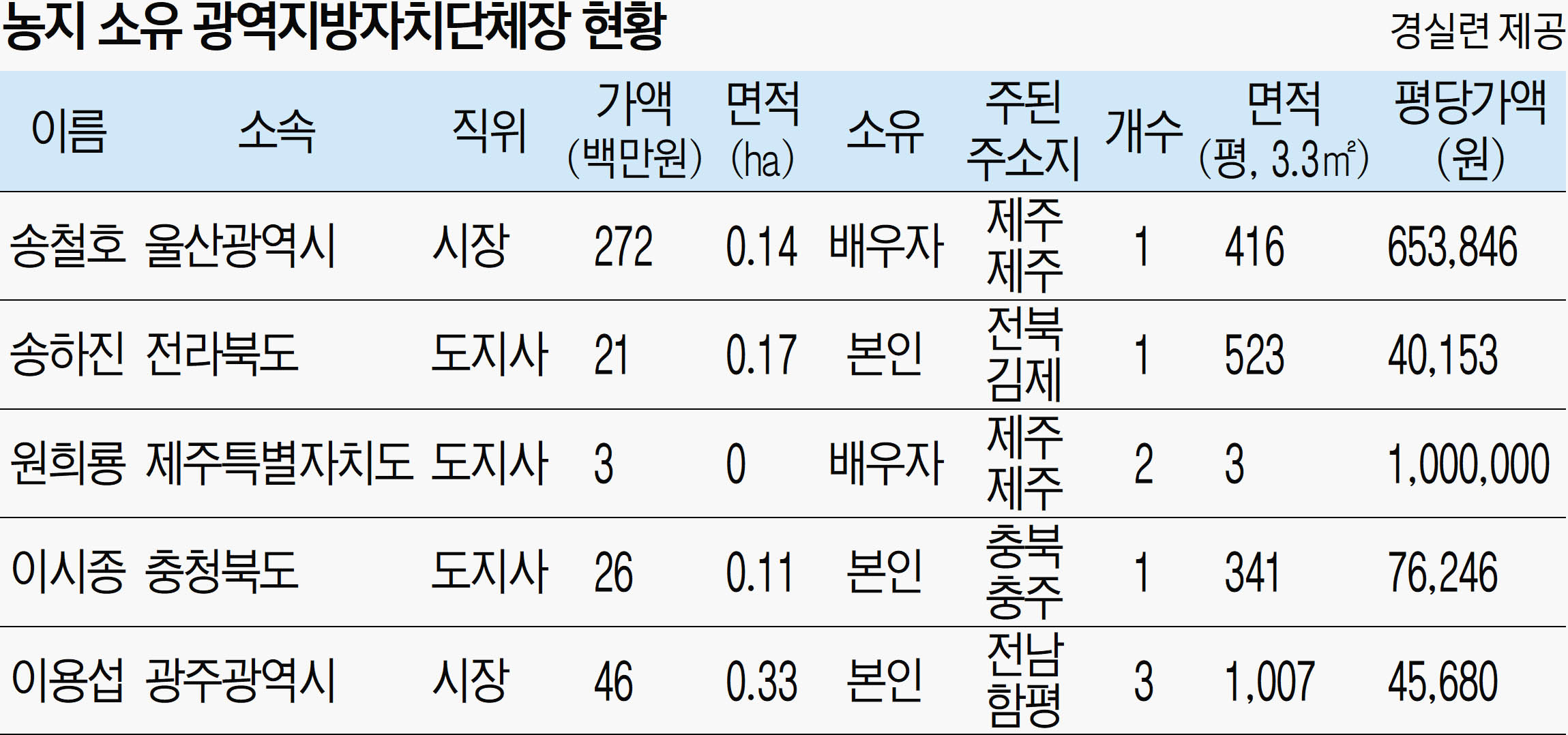 시·도지사, 시장·군수 등 지방자치단체장 2명 가운데 1명은 농지를 소유하고 있는 것으로 나타났다.