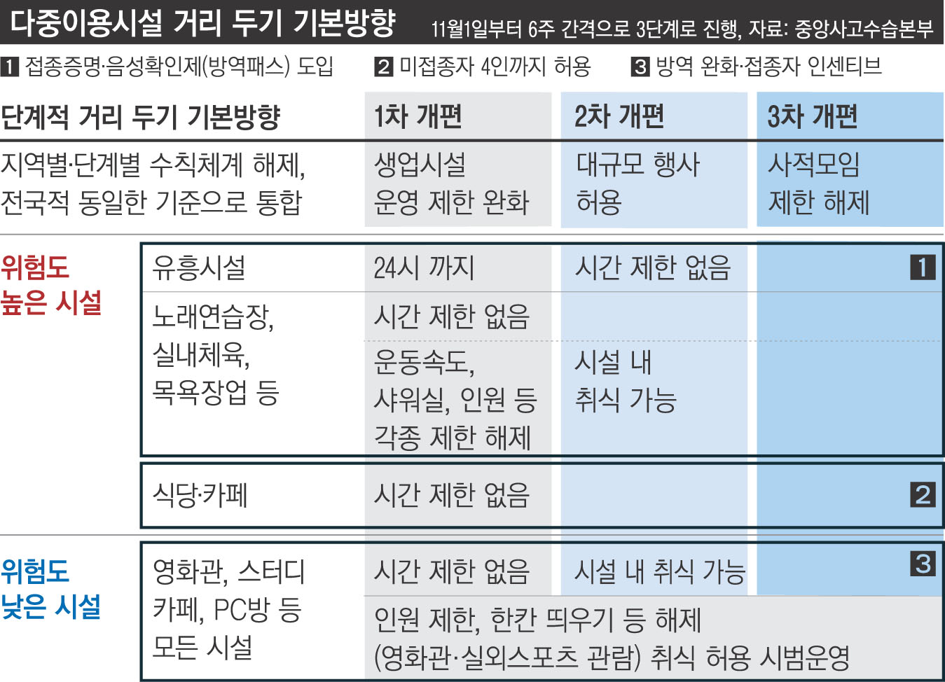 일상회복은 1차 생업시설 운영 제한 완화, 2차 대규모 행사 허용, 3차 사적모임 제한 해제 등 3단계로 진행한다.