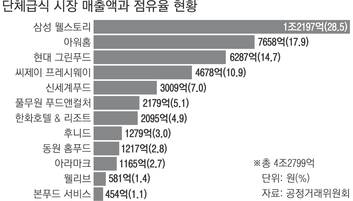 대기업 8곳이 25년간 계열사에 몰아주던 단체급식 일감을 외부에 개방하기로 했다. 4조원 규모가 넘는 시장의 80% 이상을 대기업들이 차지한 구조가 바뀌는 것이다.