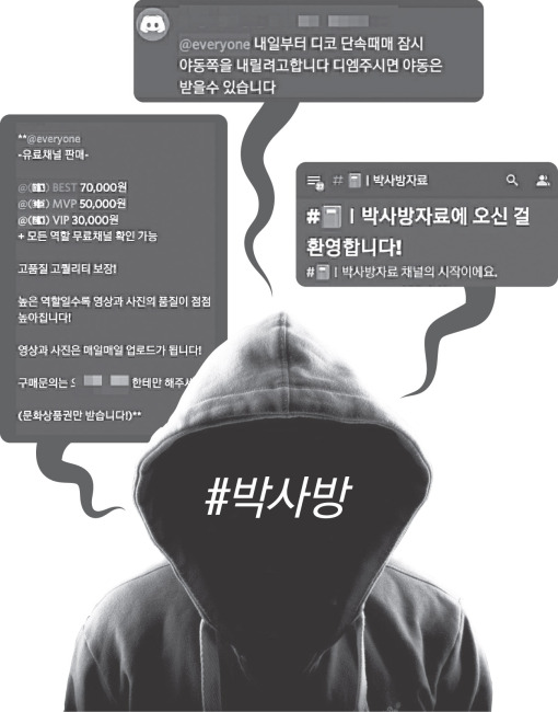 세간에 ‘n번방’으로 알려진 텔레그램 ‘박사방’ 등에서 유통되던 성착취물을 판매한다고 홍보하는 서버도 있었다. 지난달 24일 기자가 접속한 디스코드의 한 서버는 ‘박사방 자료에 오신 걸 환영합니다’라는 내용을 공지로 띄워놓고 영업하고 있었다. 운영자는 “(박사방에 있었던) 연예인(영상)도 따로 보유 중이고 레전드들이 진짜 많다”고 공지했다. 또 다른 디스코드 서버에는 “딥페이크(인공지능 기반 얼굴 합성 변조 기술), 연예인, 합성짤 등등 매우 많다”고 홍보하는 게시물도 눈에 띄었다.
