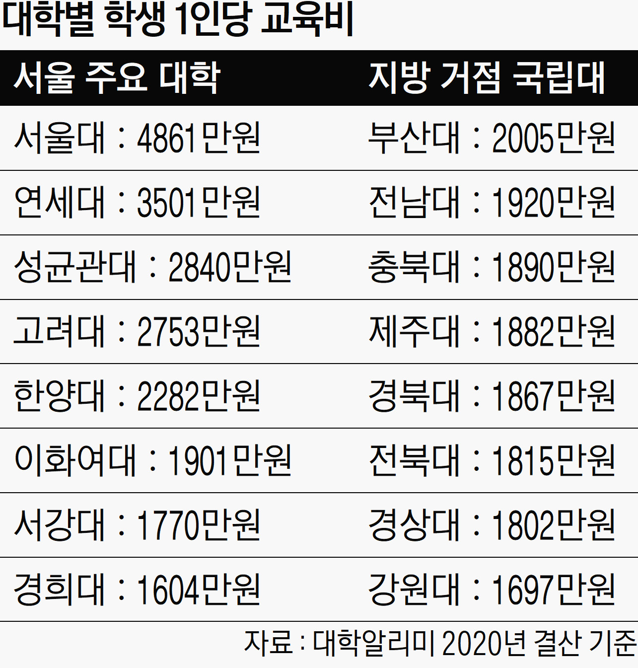 대학알리미 공시자료를 보면, 지난해 서울대 학생 1인당 교육비는 4861만원으로 거점 국립대 9곳 평균인 1851만원의 2.6배에 달한다.