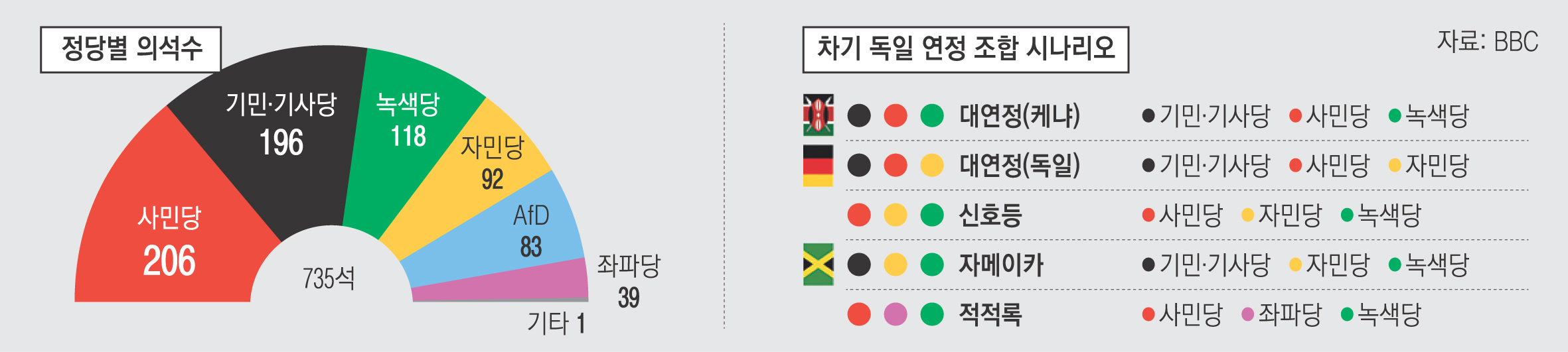 의석수로 환산하면 전체 735석 중 사민당이 206석, 기민·기사당은 196석, 녹색당은 118석, 자민당은 92석, AfD는 83석, 좌파당은 39석을 각각 차지하게 됐다.