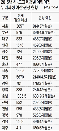 17개 시·도교육청 중 하반기(7~12월)에 누리과정 예산을 편성한 곳은 대구, 대전, 울산, 경북, 충남, 세종(10월까지) 등 6곳뿐이다. 6월까지만 예산을 편성한 부산, 충북, 인천과 5월 중 예산이 바닥나는 서울을 비롯해 11개 지역은 당장 다음달부터 ‘0원 예산’이 현실이 됐다.