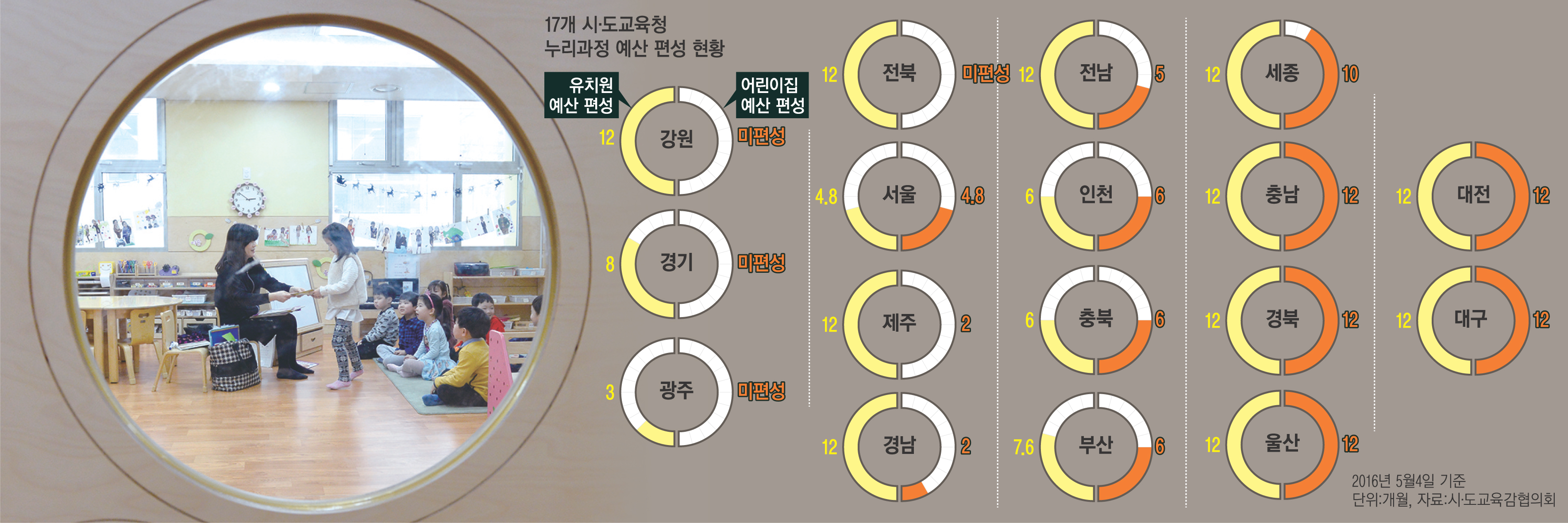 17개 시·도교육청 중 하반기(7~12월)에 누리과정 예산을 편성한 곳은 대구, 대전, 울산, 경북, 충남, 세종(10월까지) 등 6곳뿐이다. 6월까지만 예산을 편성한 부산, 충북, 인천과 5월 중 예산이 바닥나는 서울을 비롯해 11개 지역은 당장 다음달부터 ‘0원 예산’이 현실이 됐다.