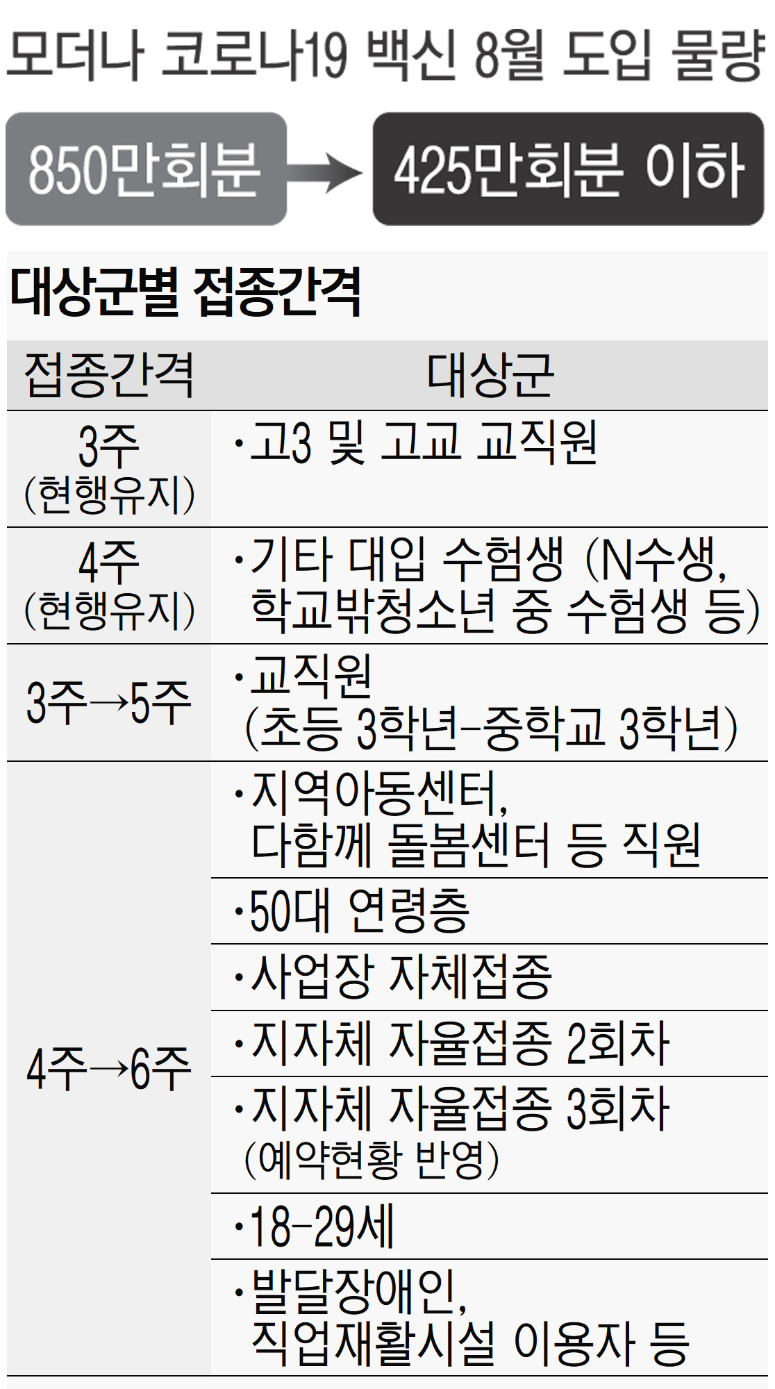 8월 중 국내에 공급 예정이던 미국 모더나사의 코로나19 백신 물량이 절반 이하로 줄어들게 되면서 ‘9월 말 전 국민 70% 1차 접종→11월 집단면역 형성’이라는 정부 계획에도 빨간불이 켜졌다.