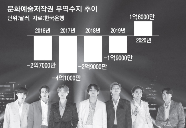 한국은행이 발표한 ‘2020년 지식재산권 무역수지’ 자료를 보면 지난해 한국의 문화예술저작권은 1억6000만달러 흑자를 냈다.