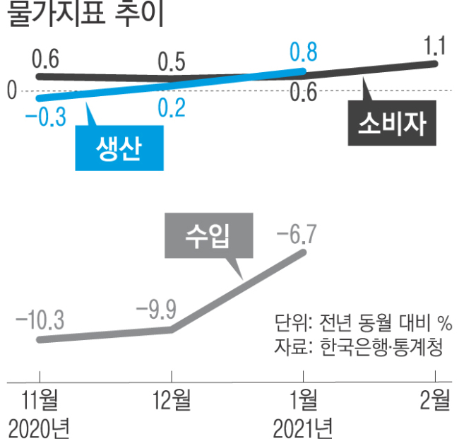 7일 한국은행과 통계청의 물가 지표를 보면, 2월 소비자물가지수는 전년 동월 대비 1.1% 상승했다. 지난해 2월(1.1%) 이후 가장 높은 상승률이다. 농산물 작황 부진과 조류인플루엔자(AI) 피해 영향 등이 겹치면서 농·축·수산물 가격이 전년 동월 대비 16.2% 급등했다. 백신 보급에 따른 전 세계적인 경기회복 기대와 원자재 가격 상승 등의 영향도 받았다. 5일(현지시간) 뉴욕상업거래소에서 4월 인도분 서부 텍사스산 원유(WTI)는 전 거래일보다 3.5%(2.26달러) 오른 배럴당 66.09달러에 장을 마감했다. 원자재 가격 상승으로 생산자물가와 수입물가 상승률도 오름세를 타고 있다.