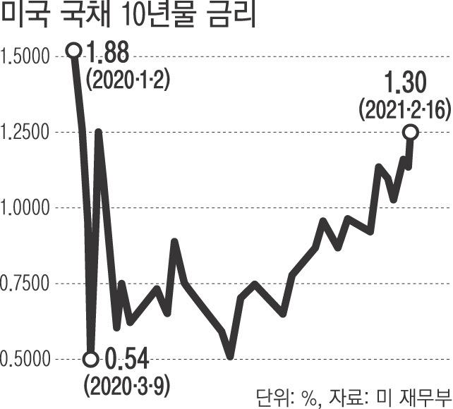 미 국채 금리가 상승하는 것은 조 바이든 미국 대통령이 1조9000억달러(약 2100조원) 규모의 추가 부양책을 추진하면서 인플레이션 압력이 가중되고 있기 때문이다. 원유·구리·곡물 등 원자재 가격이 급등하는 것도 인플레이션 우려를 키우고 있다.