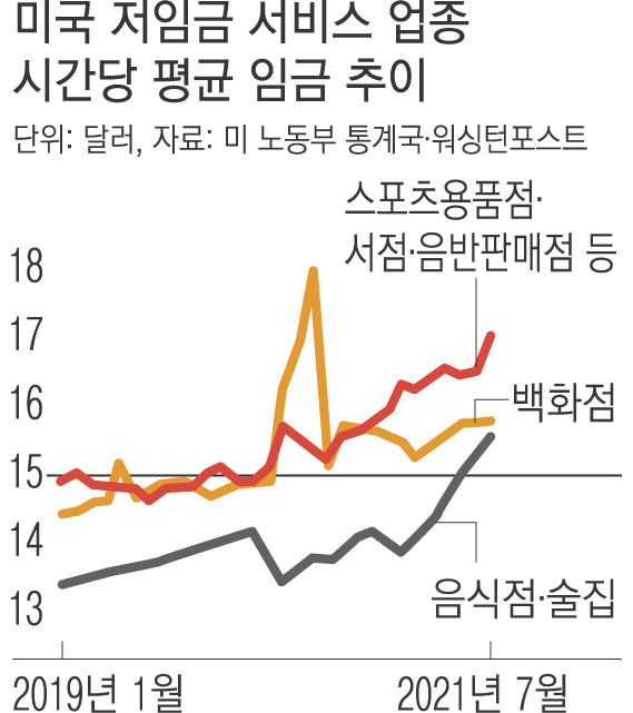 코로나19 봉쇄로 침체됐던 미국 경제가 살아나면서 식당과 슈퍼마켓 등에 종사하는 저임금 노동자들의 시간당 평균 임금이 역사상 처음으로 15달러(약 1만7200원)를 넘어섰다고 워싱턴포스트가 8일(현지시간) 보도했다.